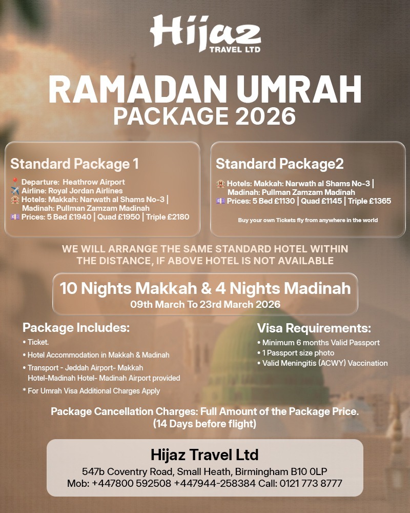 Perform Umrah during the blessed month of Ramadan with Hijaz Travel Ltd, offering carefully planned packages with comfort, guidance, and peace of mind.